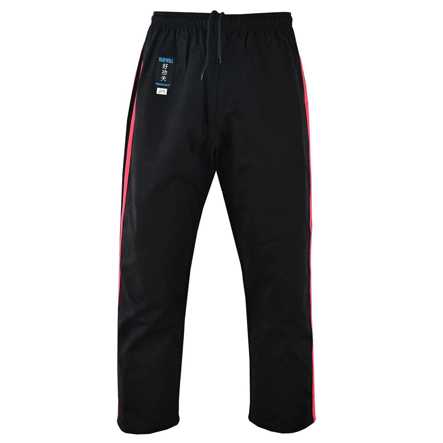 Medium Weight Full Contact Trousers, Suitable for All styles of Martial Arts. Made of 100% cotton. With Elasticated Waist band. Trousers are all Black in colour, with to contrasting Red stripes on both sides of the trouser.
