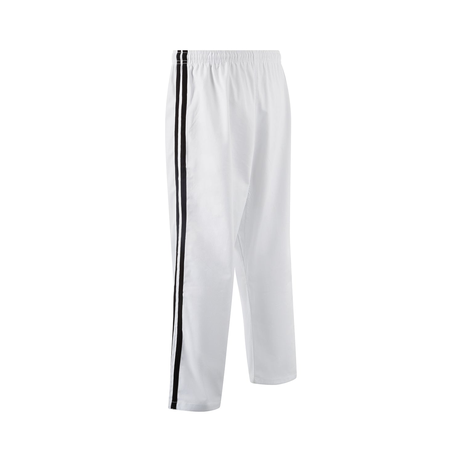 Medium Weight Full Contact Trousers, Suitable for All styles of Martial Arts. Made of 100% cotton. With Elasticated Waist band. Trousers are all white in colour, with to contrasting black stripes on both sides of the trouser.