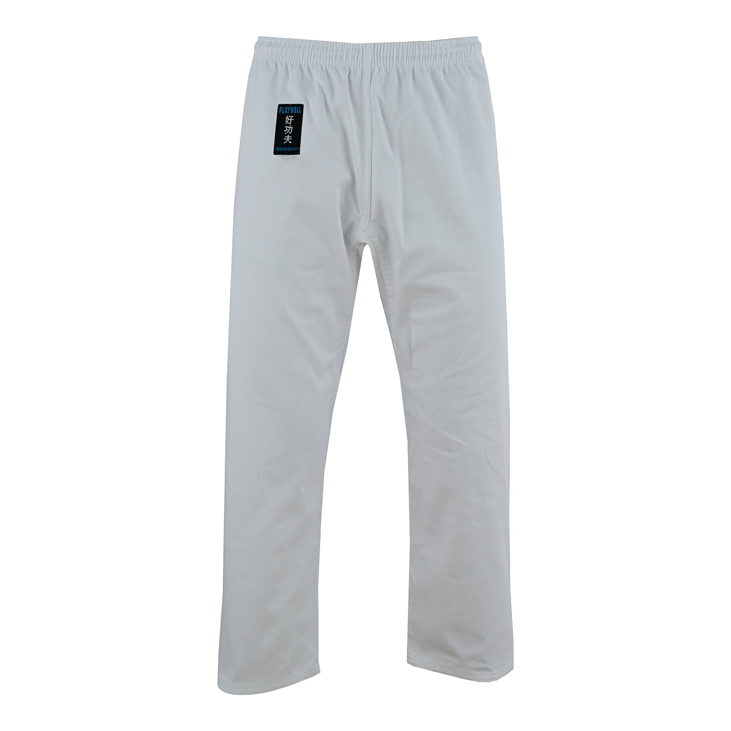 The finest woven cotton fabric makes this uniform from Playwell the master's choice. Made of Mediumweight 10 oz. 100% cotton . Top Quality. Jacket is trimmed in Black Trim. Cuffs and Hems Feature 10 Rows of Stitching. Set includes jacket and pants featuring a traditional Elastciated Waist Band (Belt not included.) Made Accordingley to Tang Soo do Specifications.
